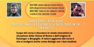 Intanto, sulla presunta illegittimità di Papa Bergoglio e sul cosiddetto “Codice Ratzinger”, lo scrittore Andrea Cionci e il filosofo Diego Fusaro realizzano un video su Youtube per promuovere dei corsi (del corso di 250 euro a persona) nei quali si propongono di “provare a ragionare su quel che sta accadendo in seno alla Chiesa di Roma in relazione al mistero delle dimissioni di Ratzinger nel 2013 e della presunta ascesa al soglio pontificio di Bergoglio, emblema del pensiero unico politicamente corretto e della evaporazione del Cristianesimo. Il corso è pensato per tutti, per addetti ai lavori come per le persone alle prime armi. Il valore aggiunto del corso è che sarà in larga parte sviluppato in forma di dibattito tra i corsisti e i due autori”.